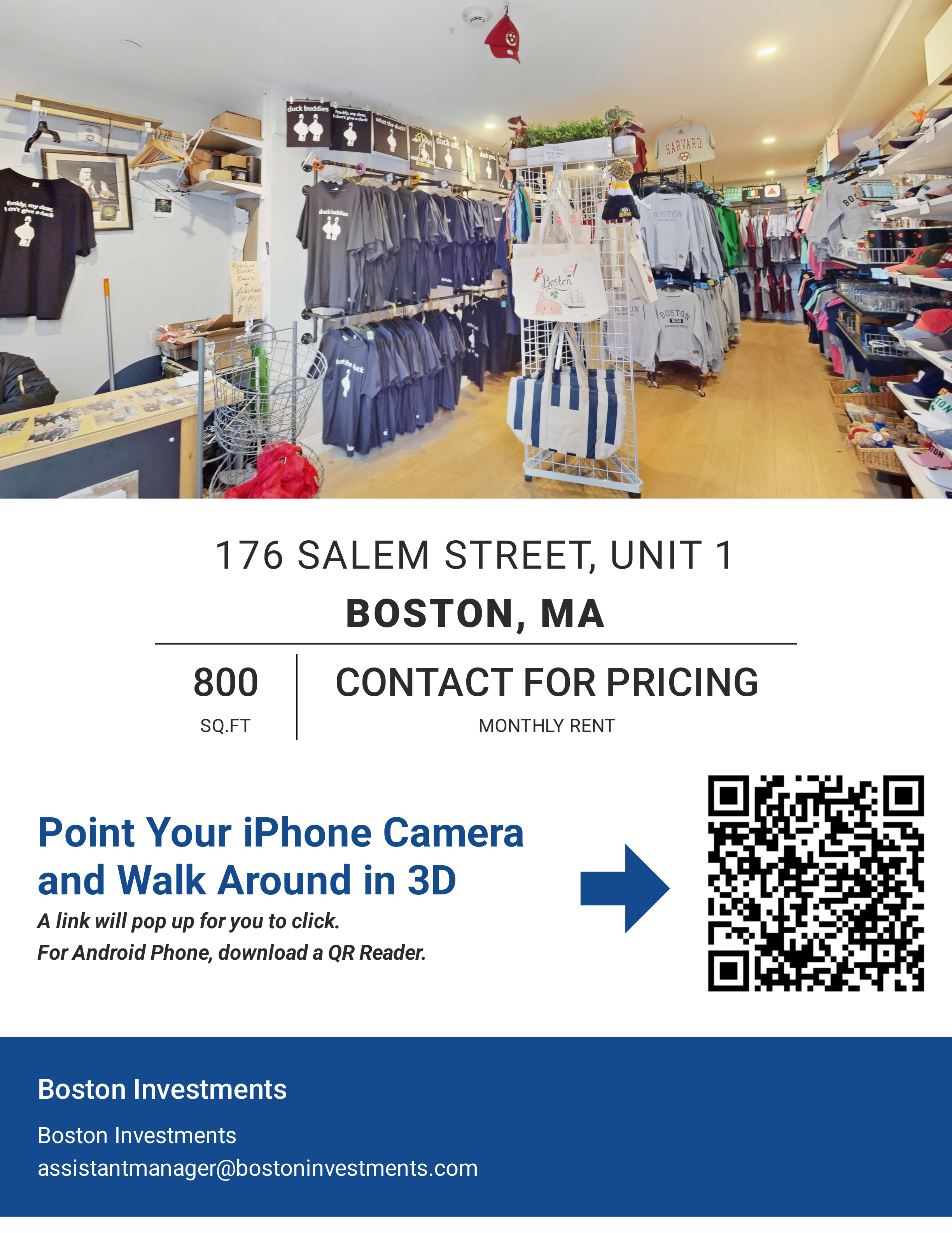 Discover the charm and versatility of this exceptional commercial space at 176 Salem Street, Unit 1, Boston, MA—a rare opportunity to establish your business in a highly desirable and bustling neighborhood. Thoughtfully designed with an efficient layout, this property offers everything needed to bring your restaurant or hospitality vision to life.
